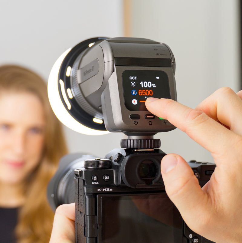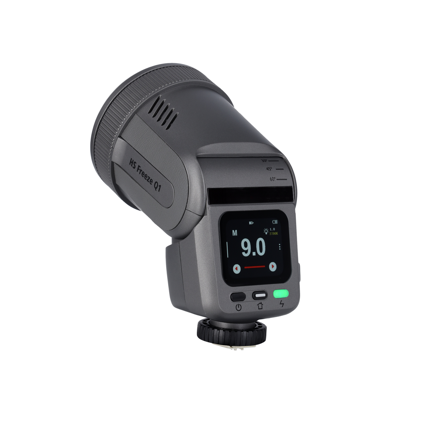 The HS Freeze Q1 LED pitch flash combines flash light and BI-Color LED lasting light in a compact device. With a key number 26, a 12 watt LED performance and the intuitive touch display, it is ideal for creative shots. Thanks to the multicompatio problem Hot Shoe, it can be used with a variety of cameras and offers maximum flexibility.