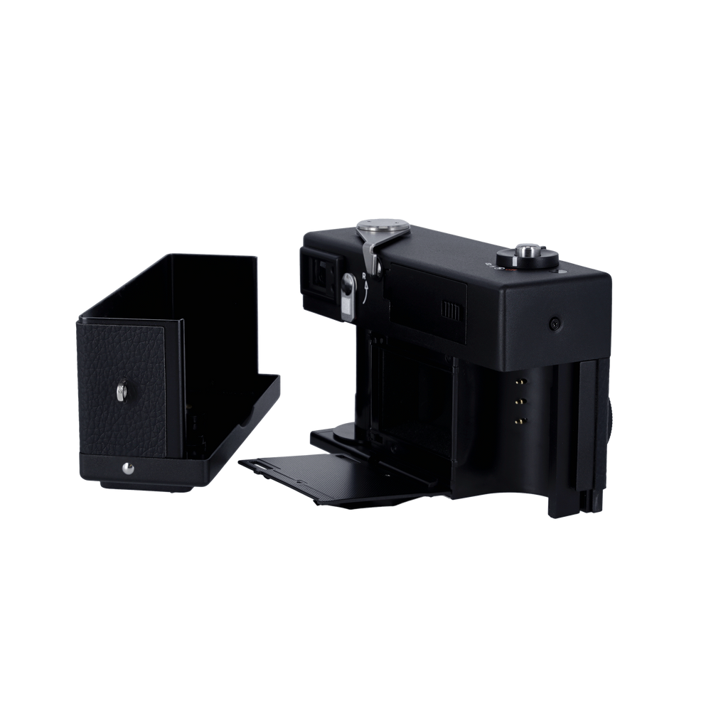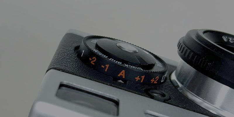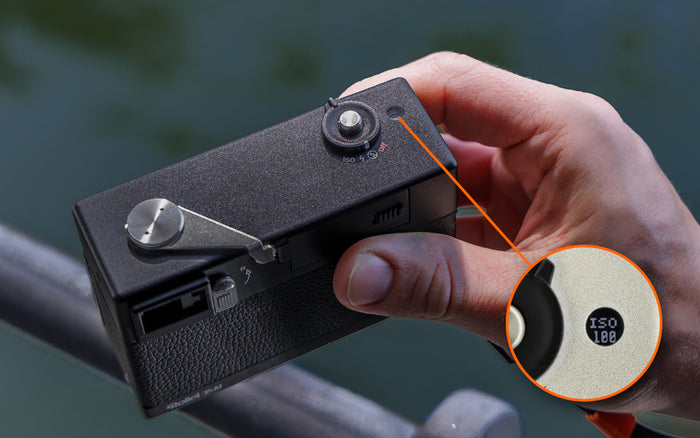 The exposure information is displayed on an OLED display, which also includes the film counter, the choice of film sensitivity and the battery display.