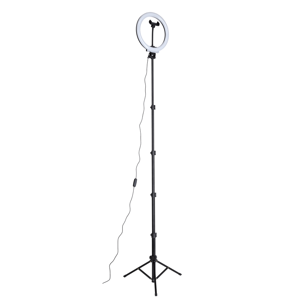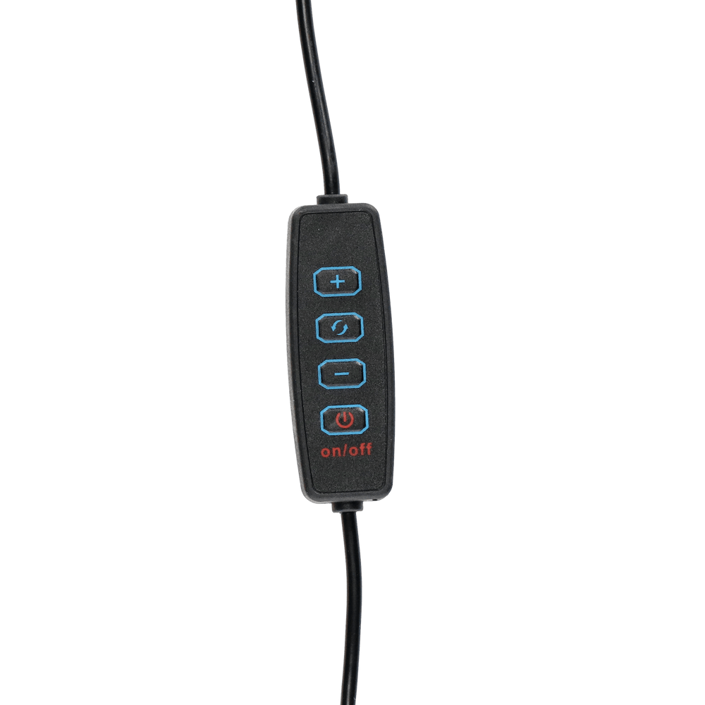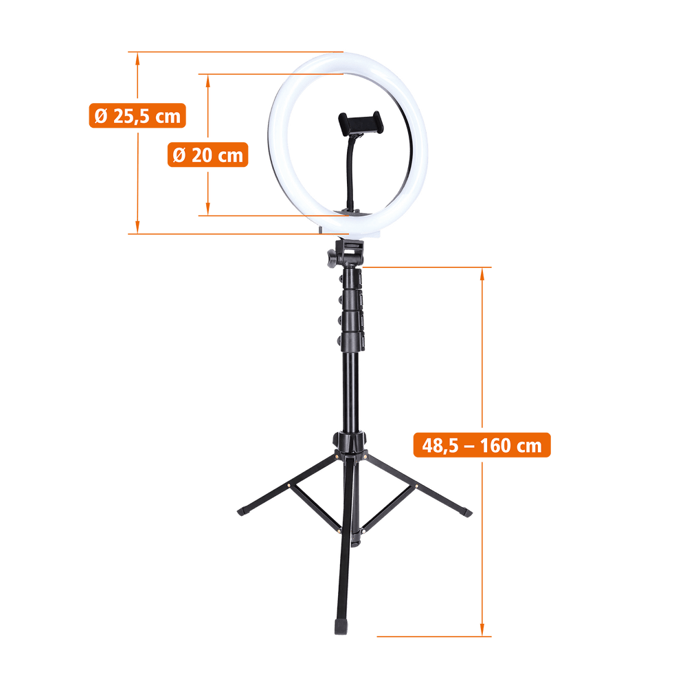 Die drei Farbmodi bieten dir mit 3.200, 4.500 und 5.500 Kelvin eine Auswahl von kaltem bis warmem Licht, das in zehn Helligkeitsstufen eingestellt werden kann. Die Einstellungen dafür werden ganz easy über die direkt am USB-Kabel integrierte Licht-Fernbedienung angepasst. Damit das Licht noch besser eingestellt werden kann, lässt sich der LED-Ring auf der horizontalen Achse schwenken. So kann der Einfallswinkel perfekt bestimmt werden. Dank des mitgelieferten Lampen-Stativs aus stabilem Aluminium kann das montierte Ringlicht auf bis zu 1,6 Meter Höhe ausgefahren werden. Mit deinem LUMIS Comfort Ringlicht Bi-Color hast du also mega viele Optionen, um das Licht genau so einzustellen, wie du es für deinen Content brauchst.
