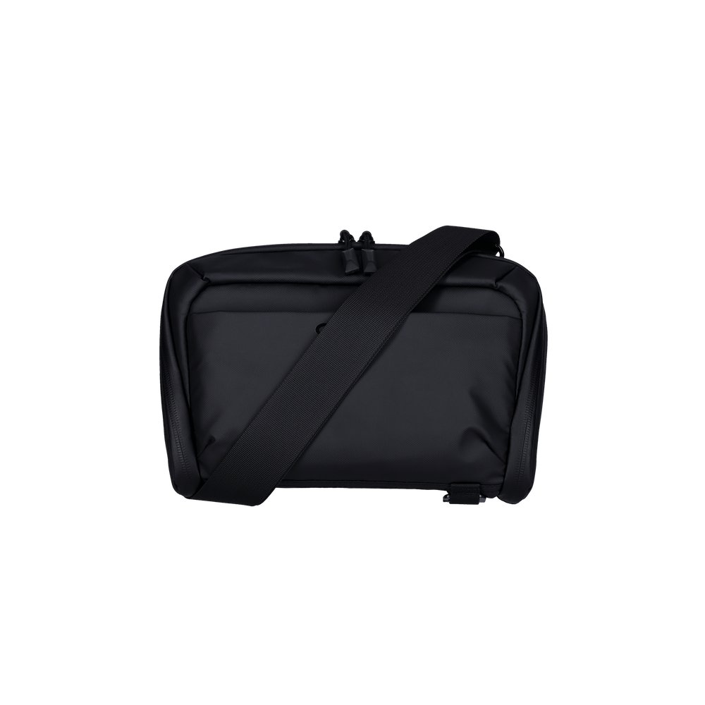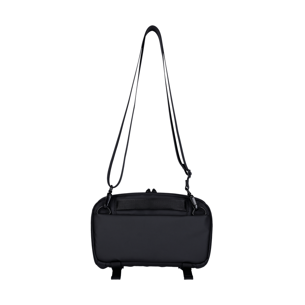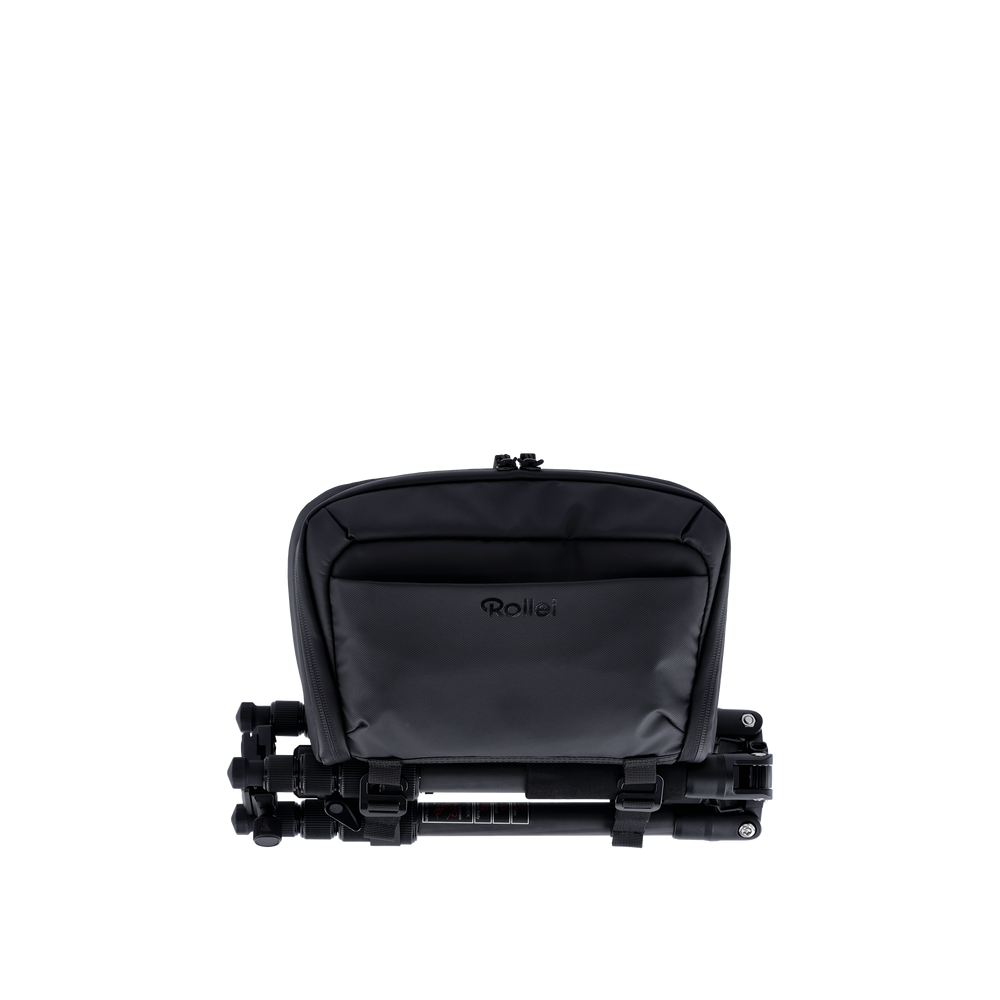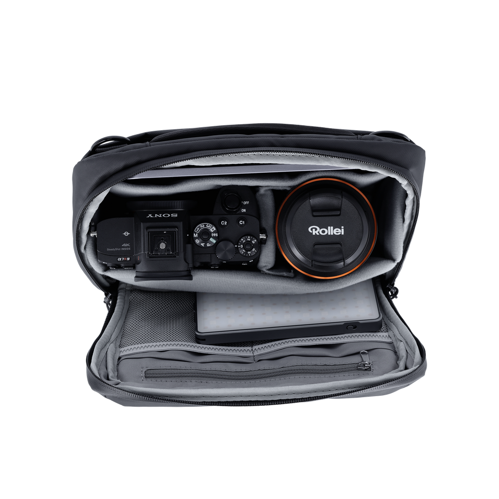 The Fotoliner Ocean Slingbag S can easily accommodate a compact camera, a lens, a small tablet, and accessories such as batteries and cables. A compact tripod, hiking poles, or clothing can be attached to the bottom.