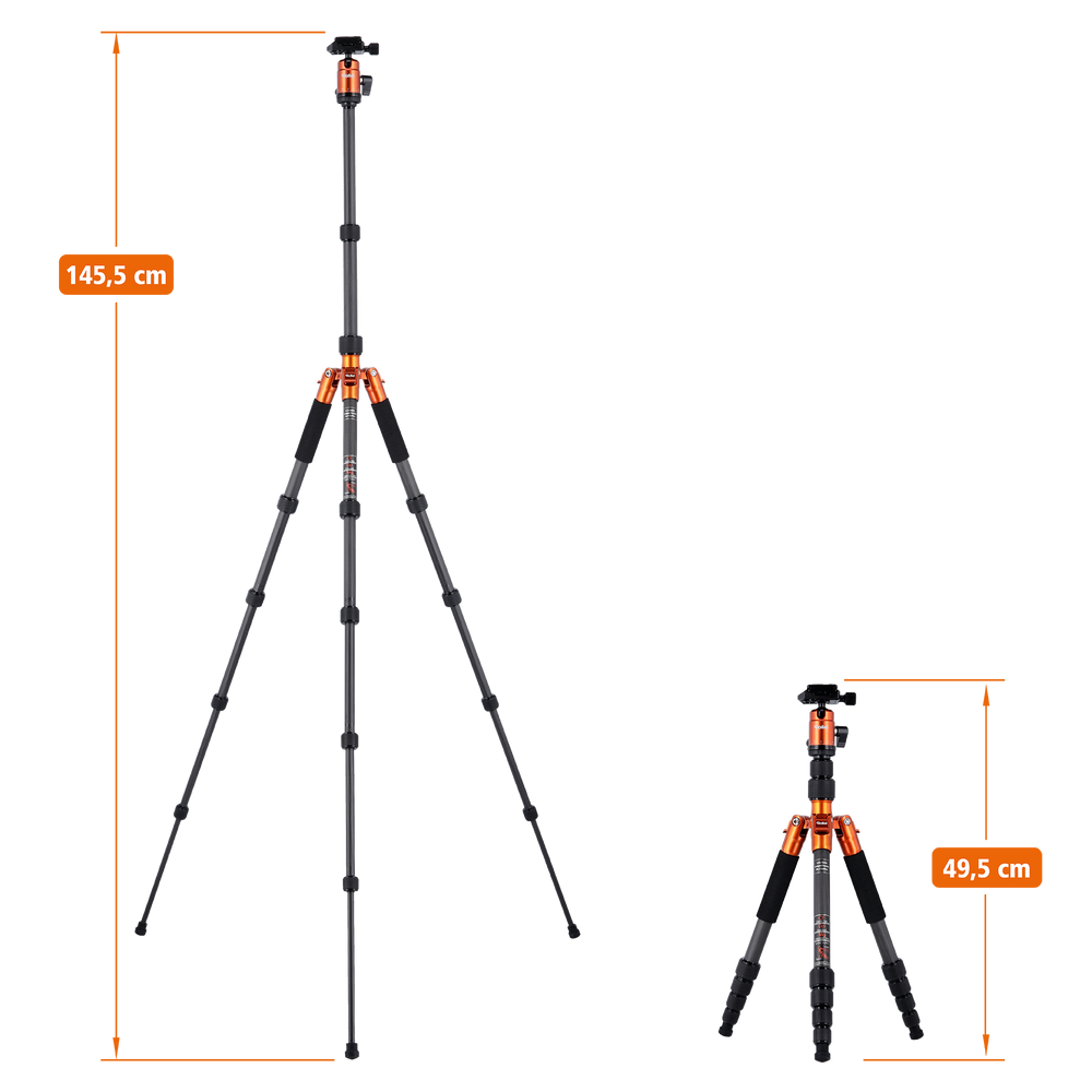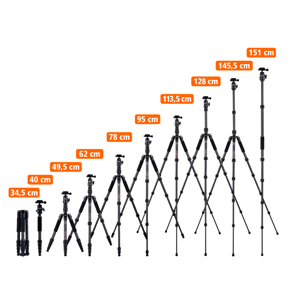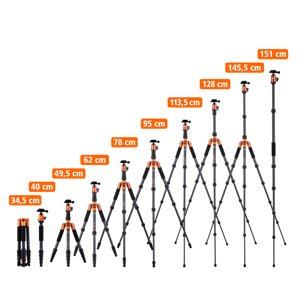 Das Stativ überzeugt durch seine ultraleichte Bauweise und sein kompaktes Format, die es zu einem praktischen Begleiter auf Reisen machen. Es findet mühelos Platz in Ihrem Gepäck und ist so leicht, dass es Sie den ganzen Tag über nicht belastet. Und trotz seiner Kompaktheit, mit einem Packmaß von nur 34,5 Zentimetern und einer maximalen Auszugshöhe von 145,5 Zentimetern, stellt es die notwendige Stabilität und Funktionalität sicher, um qualitativ hochwertige Fotos zu erzielen.