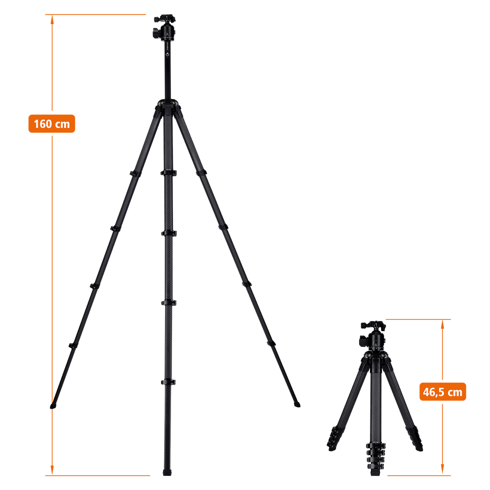 Das Stativ erreicht eine maximale Höhe von 160 Zentimetern, wodurch Sie flexibel die gewünschte Aufnahmeposition einstellen können. Diese Funktion ist besonders nützlich für Fotografen, die unterschiedliche Perspektiven und Blickwinkel erforschen möchten, von eindrucksvollen Landschaftsaufnahmen bis hin zu dynamischen Porträts.